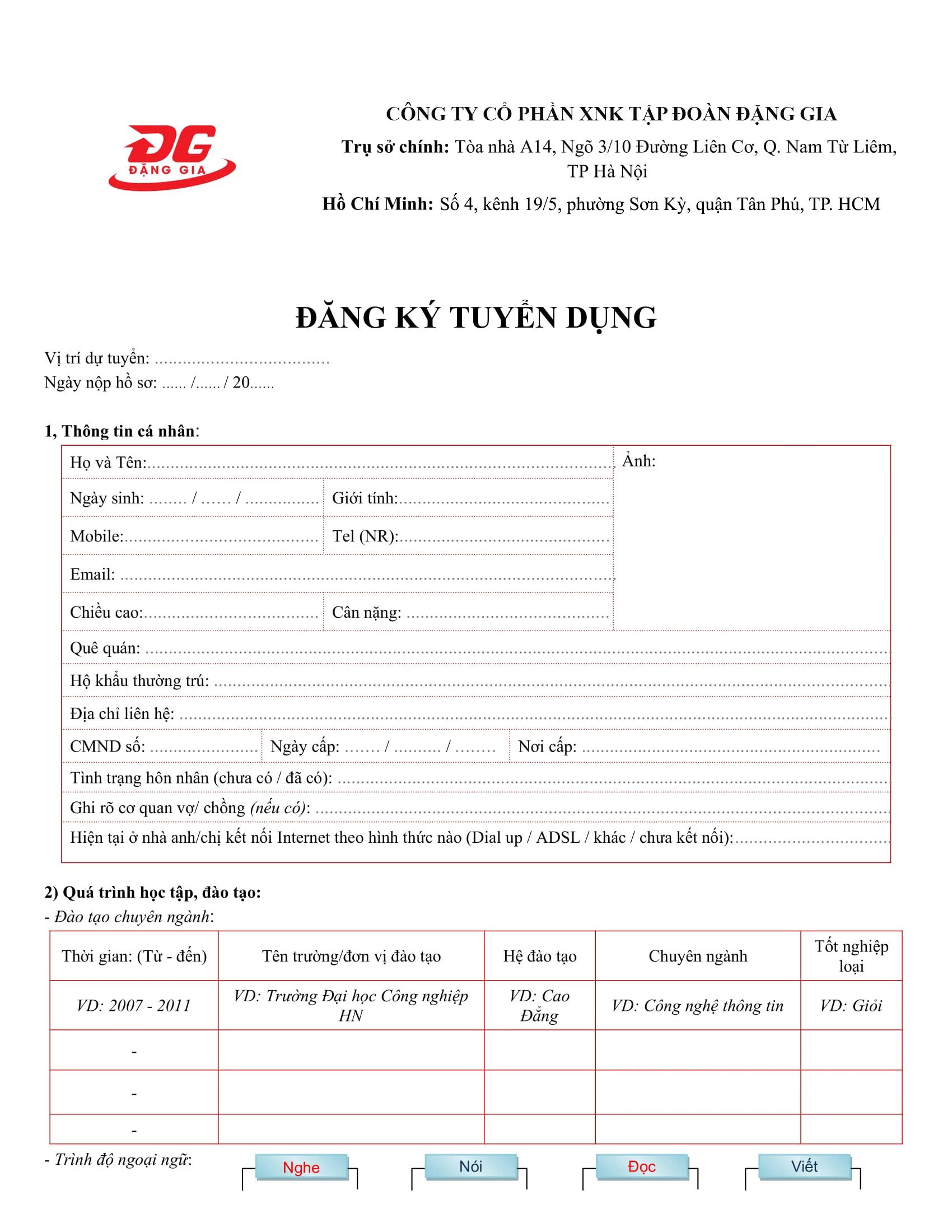 Ứng viên quan tâm tới các vị trí tuyển dụng của Đặng Gia vui lòng điền đầy đủ thông tin theo yêu cầu của bản đăng ký và gửi về địa chỉ email tuyendung@trungtammuasam.vn . Xin cảm ơn!