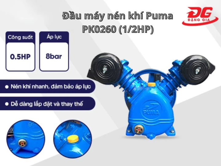 Nếu bạn đang tìm kiếm một đầu nén khí bền bỉ để thay thế linh kiện cũ hoặc tự lắp ráp máy nén khí cho xưởng gỗ, tiệm sửa xe, thì đầu máy nén khí Puma Đài Loan PK0260 (1/2HP) là lựa chọn rất đáng cân nhắc. Sản phẩm nổi bật nhờ khả năng nén khí nhanh, vận hành ổn định và tiết kiệm điện năng.
