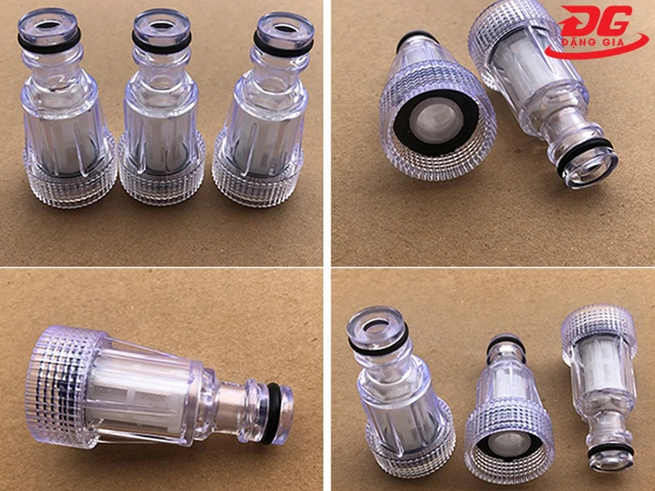 - Đầu lọc nhựa trong: Có giá thành rẻ, nhựa trong nên dễ quan sát. Phụ kiện này thay thế được nhanh, nên dùng cho máy rửa xe mini.