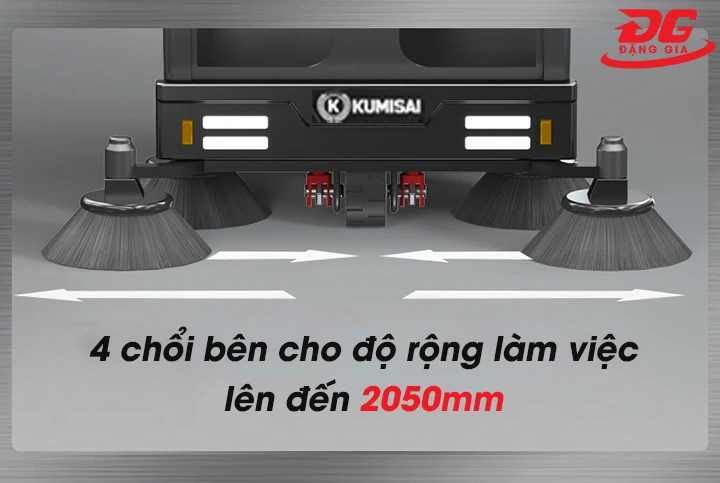 Xe quét rác ngồi lái Kumisai KMS-S15 sở hữu 4 chổi bên, cho độ rộng làm việc lên đến 2050mm, thu gom bụi bẩn rác thải đưa hết vào thùng rác dung tích lớn 200L, với mỗi giờ làm việc máy có thể làm sạch 15000 m2.