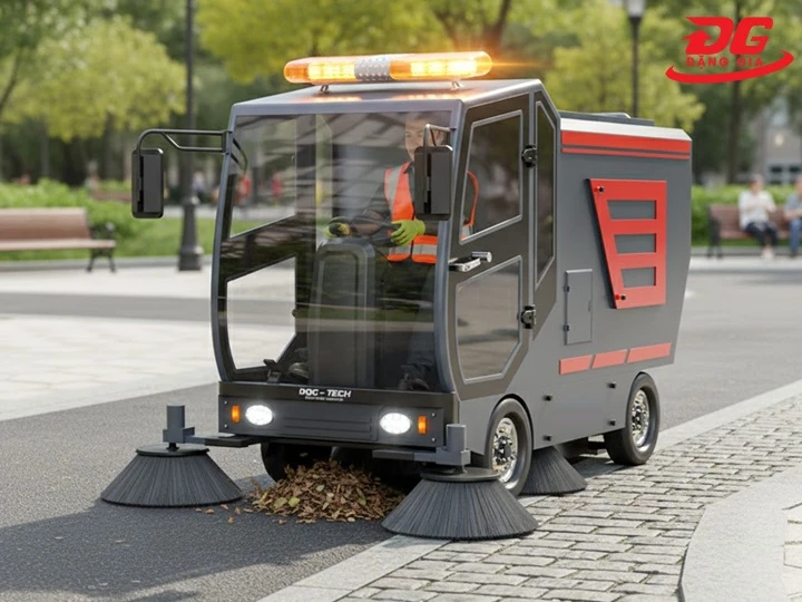 Xe quét rác ngồi lái DQC - Tech 18F hoạt động theo nguyên lý quét - gom - lọc bụi khép kín, sử dụng hoàn toàn năng lượng điện. Cơ chế này giúp thiết bị làm sạch nhanh, liên tục và hạn chế tối đa bụi phát tán ra môi trường.
